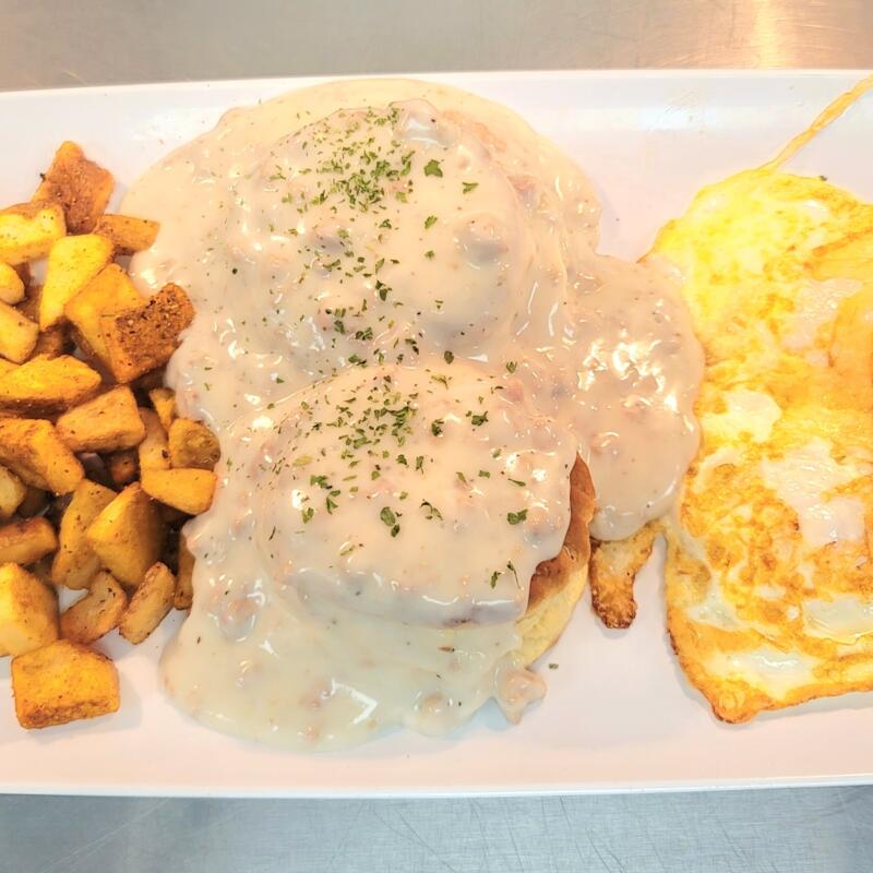 Two biscuits, smothered with our homemade sausage gravy topped with two eggs and served with Maggie's potatoes