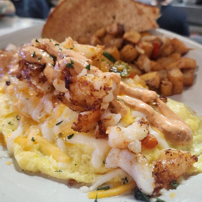 A mouthwatering combination of shrimp, mixed bell peppers, onions, mixed cheese, and Chipotle sour cream. Served with Maggie's Potatoes and your choice of toast
